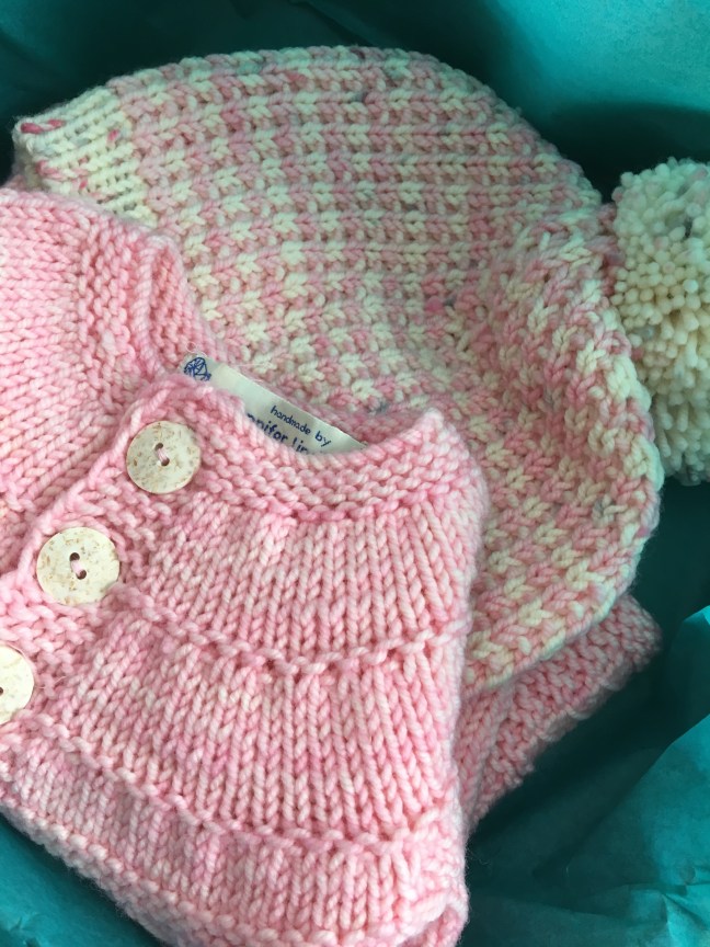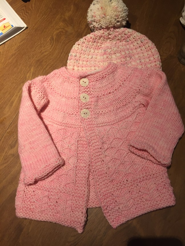 Here’s a Coming Home Sweater that I made for our cousin’s second little girl. I made matching hats for her and her big sister as well.